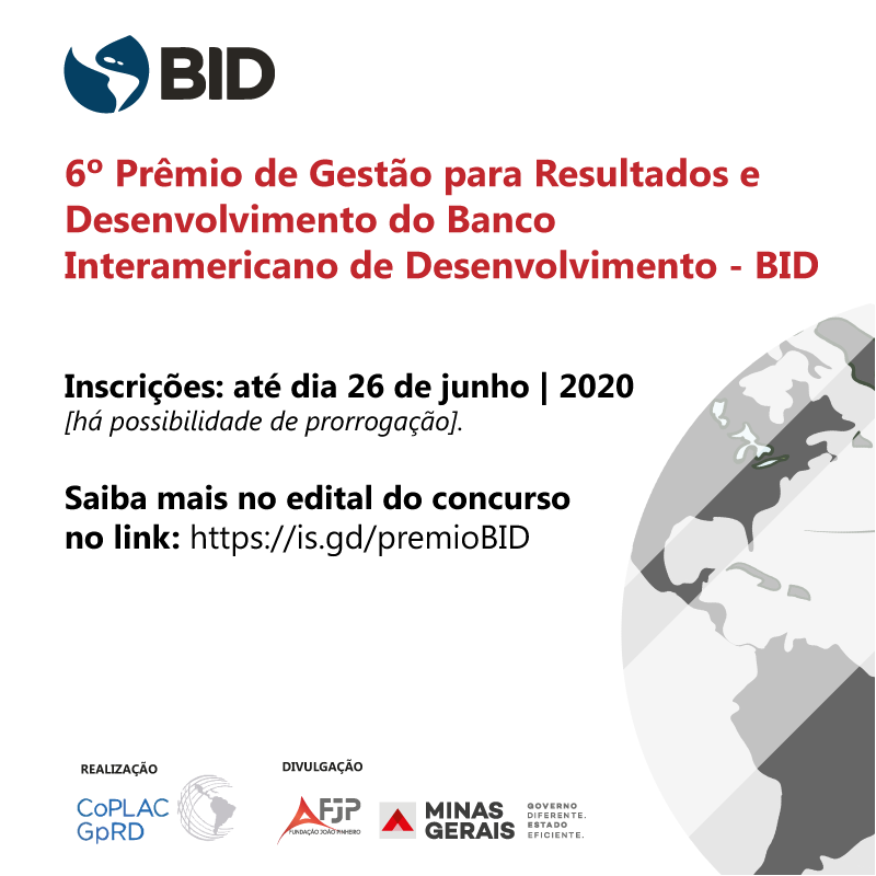 A Fundação João Pinheiro – FJP, instituição do Governo do Estado de Minas Gerais, em parceria com a Comunidade de Profissionais e Especialistas da América Latina e Caribe em Gestão para Resultados de Desenvolvimento (CoPLAC-GpRD), está apoiando o 6º Prêmio de Gestão para Resultados e Desenvolvimento, promovido pelo Banco Interamericano de Desenvolvimento – BID com o objetivo de reconhecer as boas práticas da gestão pública em países da América Latina e Caribe. As inscrições para o prêmio já estão abertas e podem ser feitas até 26 de junho.