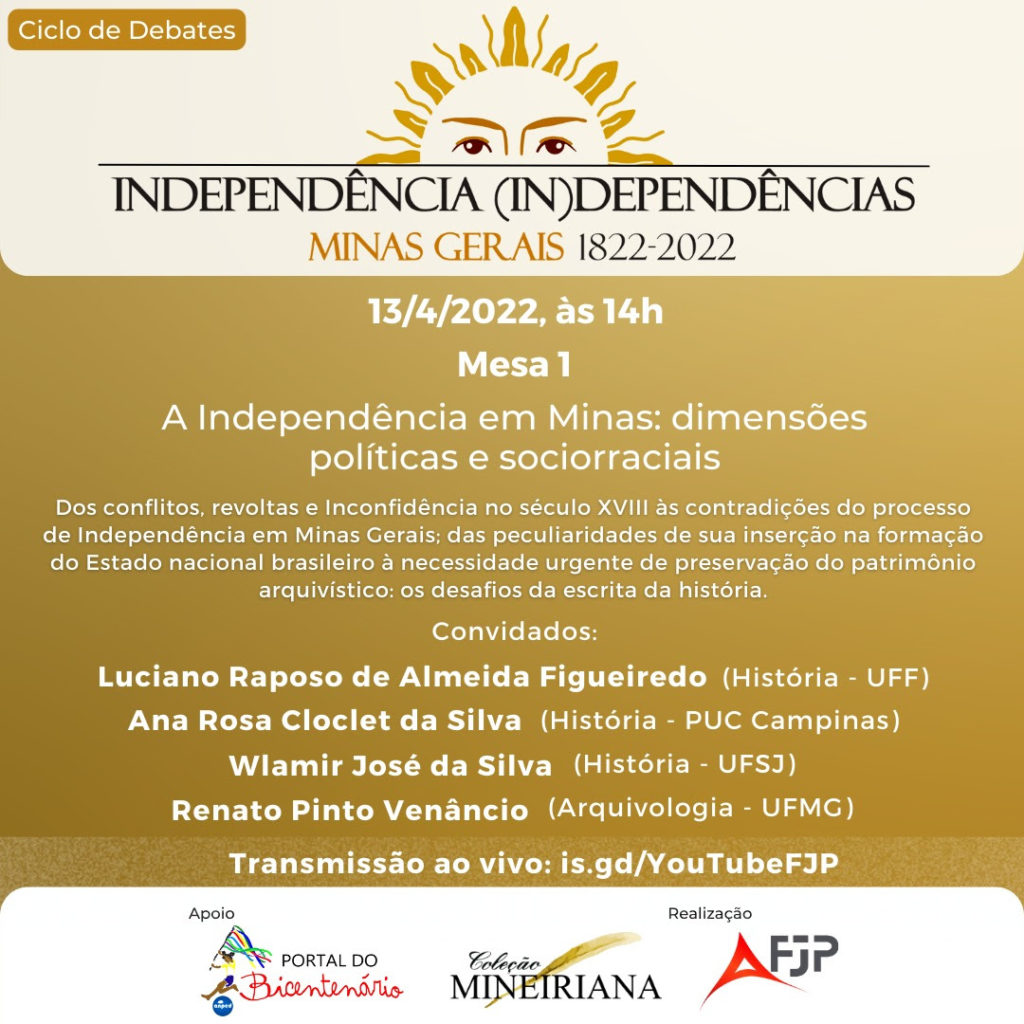 Para marcar os 200 anos da independência do Brasil em 2022, a Fundação João Pinheiro, em parceria com o Portal do Bicentenário, vai realizar, em abril e maio, o ciclo de debates Independência, (In)Dependências – rupturas e permanências na cena histórica e contemporânea de Minas Gerais 1822-2022. Com a participação de especialistas de várias áreas, a iniciativa visa a transformar a data em um momento de reflexão sobre história, memória, poder e exclusão no contexto da trajetória brasileira e, particularmente, de Minas Gerais.