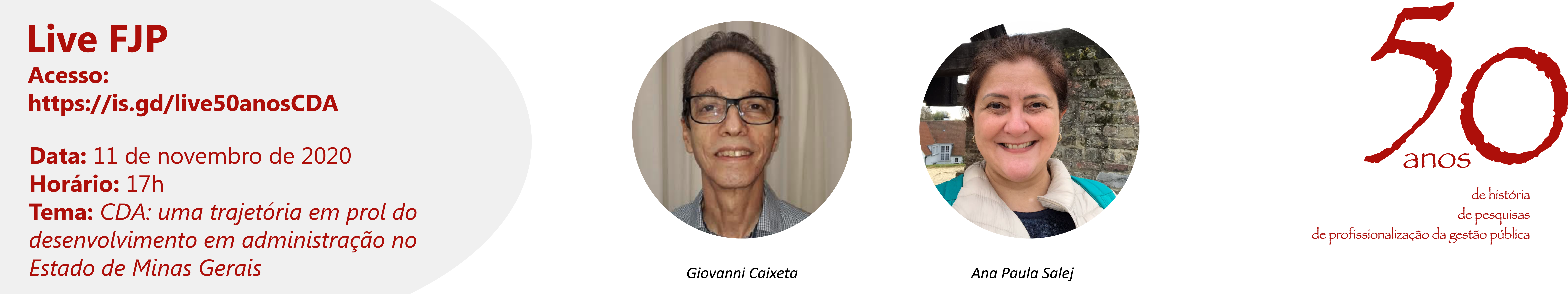 Nesta próxima quarta-feira, 11 de novembro, a Fundação João Pinheiro – FJP recebe os pesquisadores Giovanni Caixeta e Ana Paula Salej para mais uma live comemorativa dos 50 anos da instituição. Desta vez, o tema do bate-papo será CDA: uma trajetória em prol do desenvolvimento em administração no Estado de Minas Gerais, foco do ensaio de mesmo nome assinado por Caixeta, escrito para o livro que irá marcar o cinquentenário da FJP. A transmissão acontece a partir das 17h, na plataforma Zoom: https://is.gd/live50anosCDA.