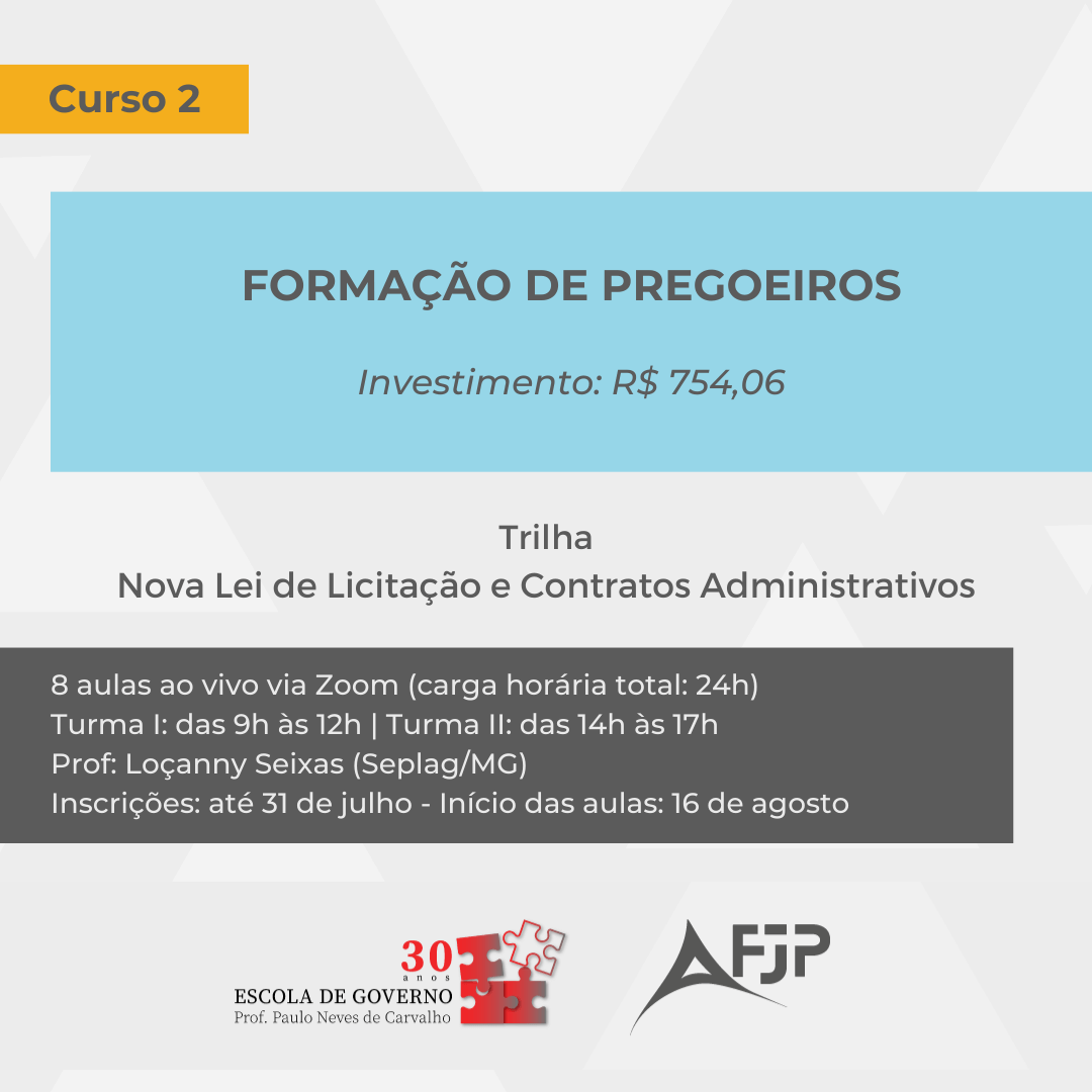 Este curso foi atualizado e adiado em razão de um decreto do Estado de Minas Gerais a ser publicado até o início de julho de 2023. O documento apresentará a regulamentação da licitação na modalidade pregão.