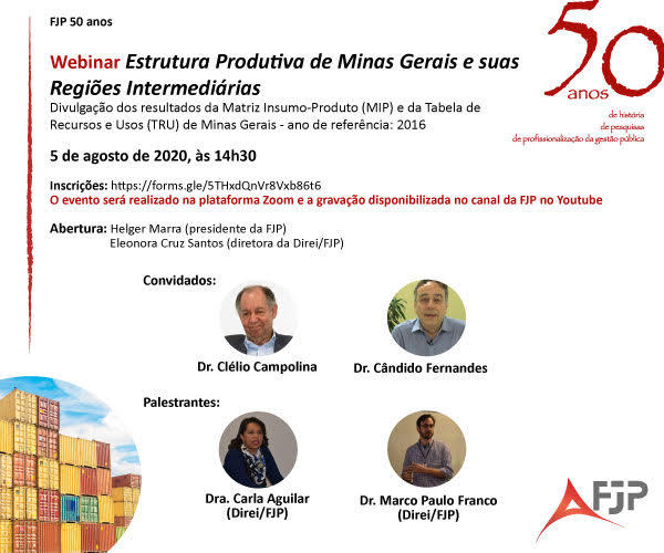 A Fundação João Pinheiro (FJP) realiza na próxima quarta-feira, 5 de agosto, o Webinar Estrutura Produtiva de Minas Gerais e suas Regiões Intermediárias, onde serão divulgados os resultados da Tabela de Recursos e Usos (TRU) e as Matrizes Insumo-Produto (MIP) do Estado de Minas Gerais e de suas Regiões Geográficas Intermediárias, referentes a 2016, destacando-se os setores de atividade com capacidade de impulsionar as economias locais.