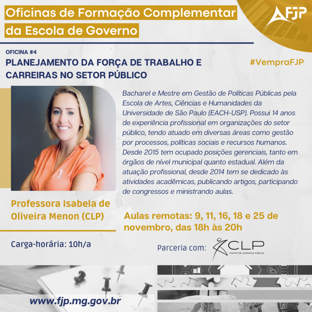 Ementa: A oficina destina-se a propiciar aos alunos uma visão geral sobre todos os subsistemas de recursos humanos, em especial àqueles que tratam sobre o planejamento da força de trabalho e carreiras no Setor Público. Além de discutir teoricamente o tema, os alunos poderão ver na prática como se elabora um planejamento da força de trabalho.