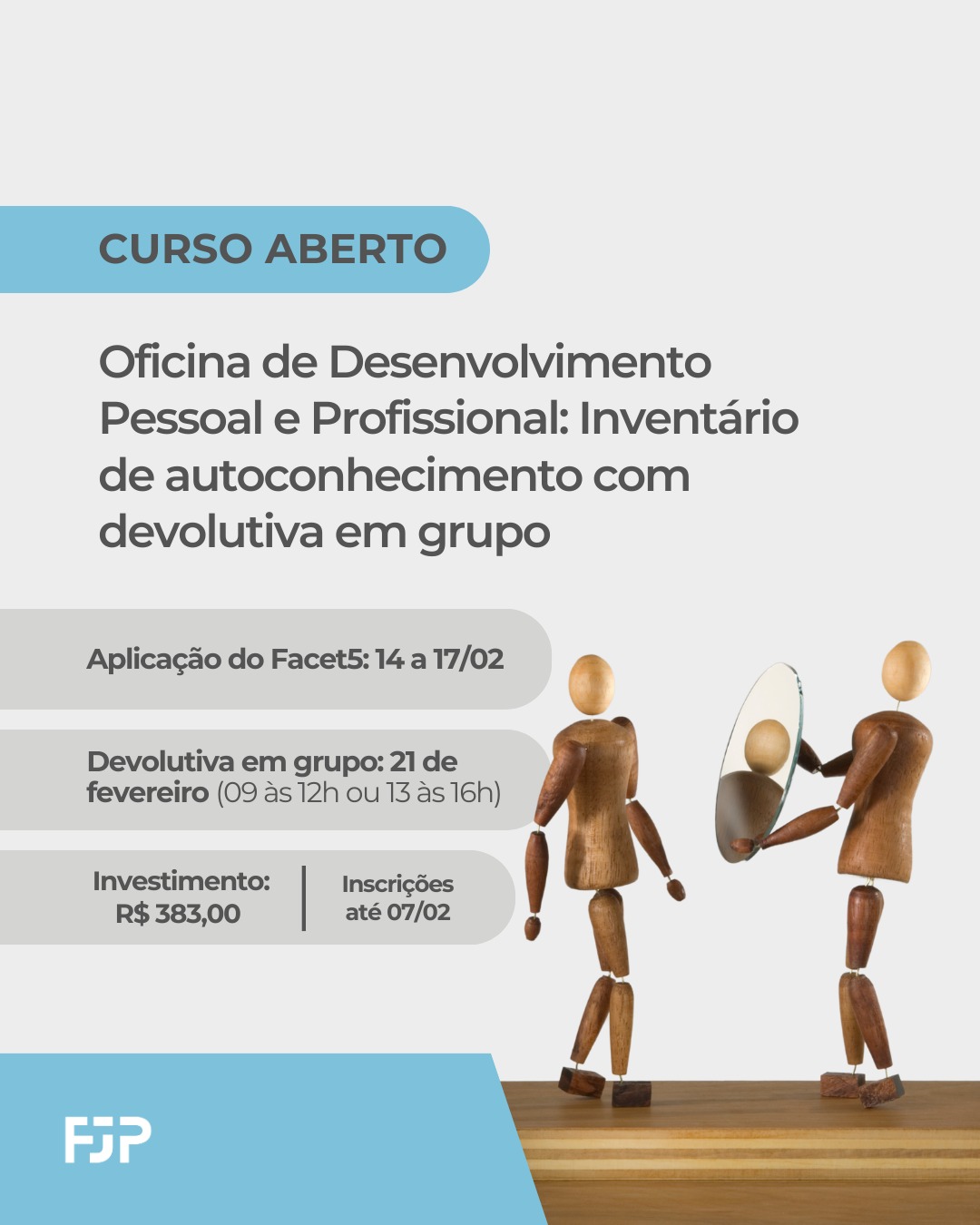 Conteúdo/Metodologia: Nesta oficina, os participantes utilizarão um instrumento capaz de fornecer um inventário da sua personalidade. Trata-se de uma ferramenta utilizada em contextos profissionais para auxiliar indivíduos e organizações a compreenderem melhor as suas características e as preferências de seus colaboradores, favorecendo o autoconhecimento e o desenvolvimento mais consciente e direcionado. Esse instrumento se chama Facet5 e se baseia na teoria dos Big Five, também conhecida como o modelo dos cinco grandes fatores de personalidade, sendo essa teoria amplamente aceita na psicologia para descrever os principais traços que compõem a personalidade humana. Posteriormente, após a aplicação do Inventário de Autoconhecimento (Facet5), os participantes receberão uma devolutiva descritiva realizada por um profissional licenciado, indicado pela EG/FJP, em dia e horário previamente agendados. Esse encontro será realizado por meio de plataforma de videoconferência, em grupos de no máximo dez participantes e com até 3h de duração. A devolutiva será seguida por discussão com o objetivo de suscitar reflexões importantes para os participantes.
