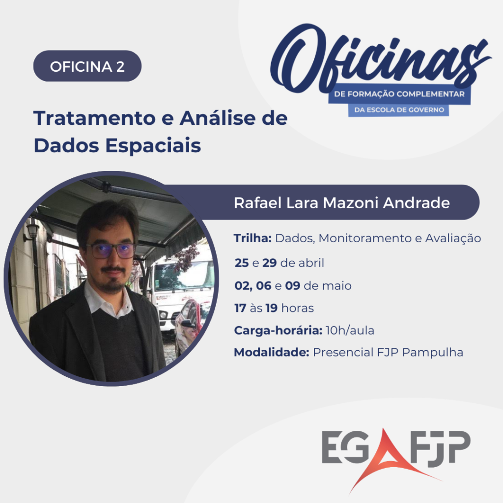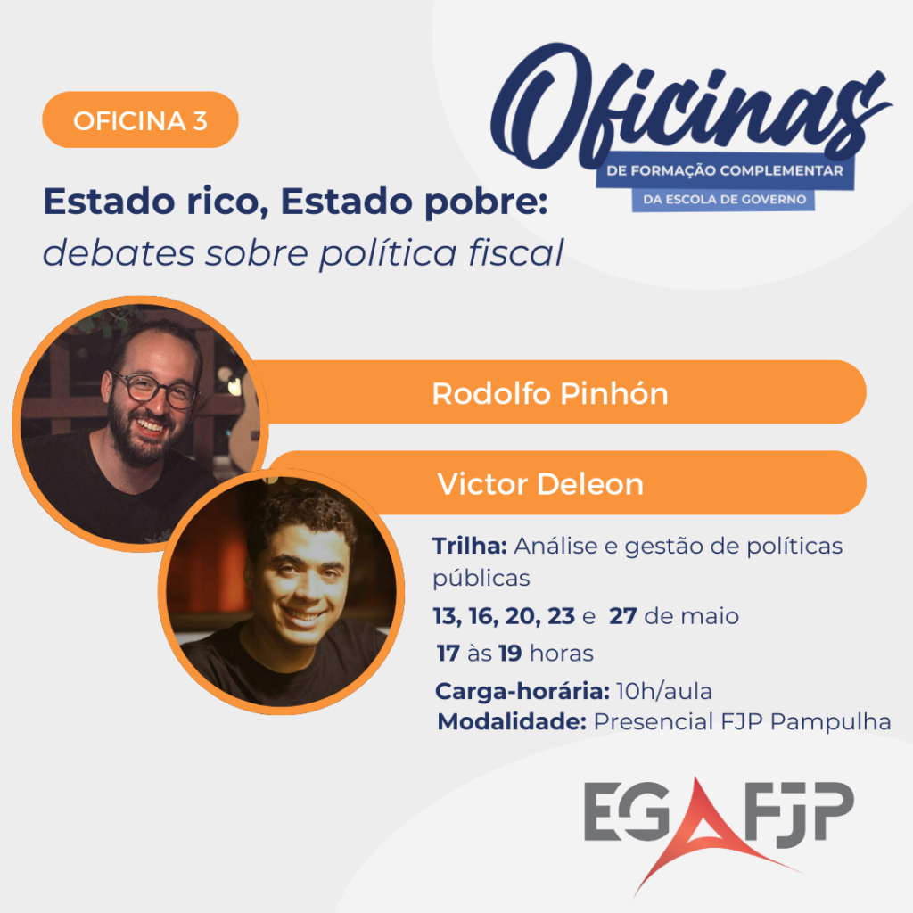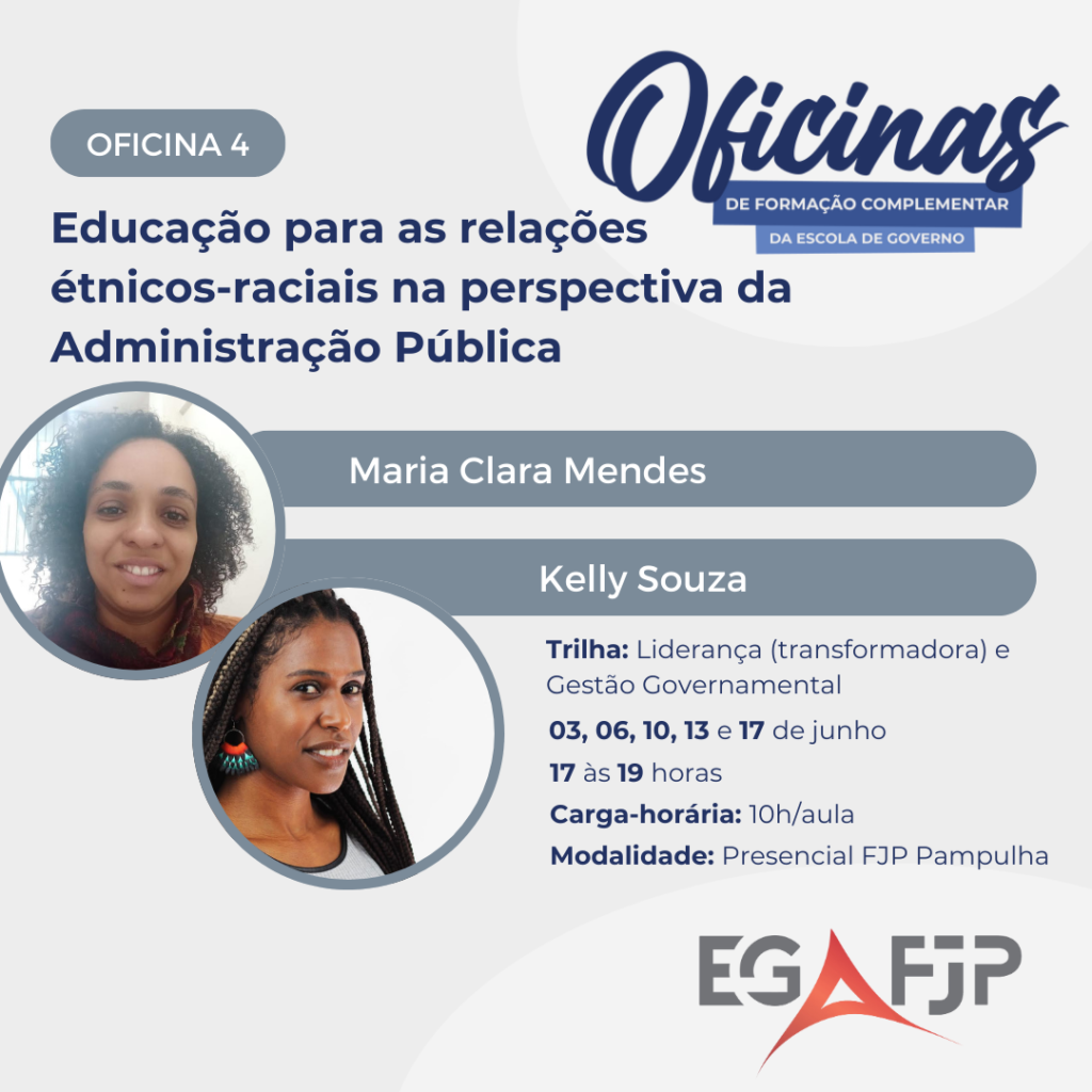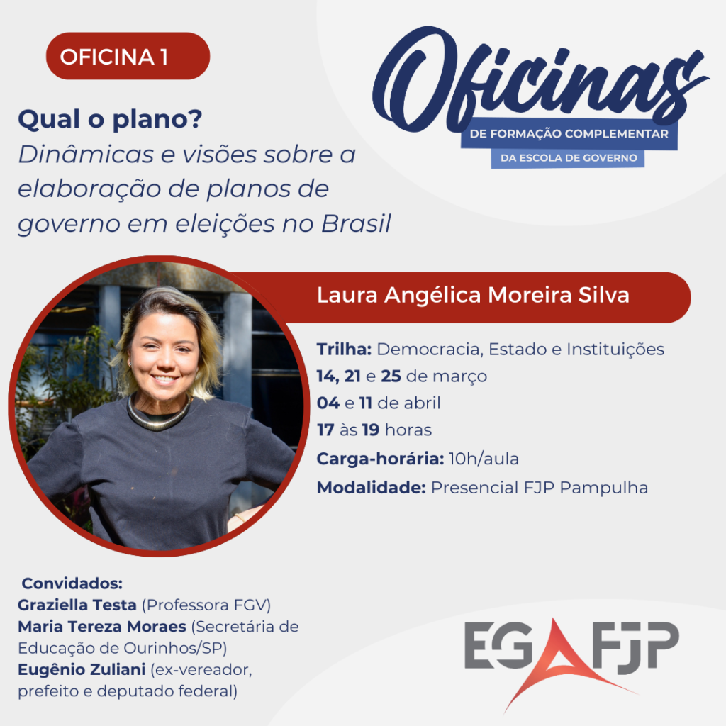 Público-alvo: as oficinas possuem um público misto. São 40 vagas por oficina, sendo que: 20 alunos regularmente matriculados na graduação, especialização ou mestrado da Escola de Governo Prof. Paulo Neves de Carvalho (FJP); 10 alunos regularmente matriculados nos cursos do campo de públicas ou outros cursos universitários afins; 10 alunos gestores/as ou público em geral.