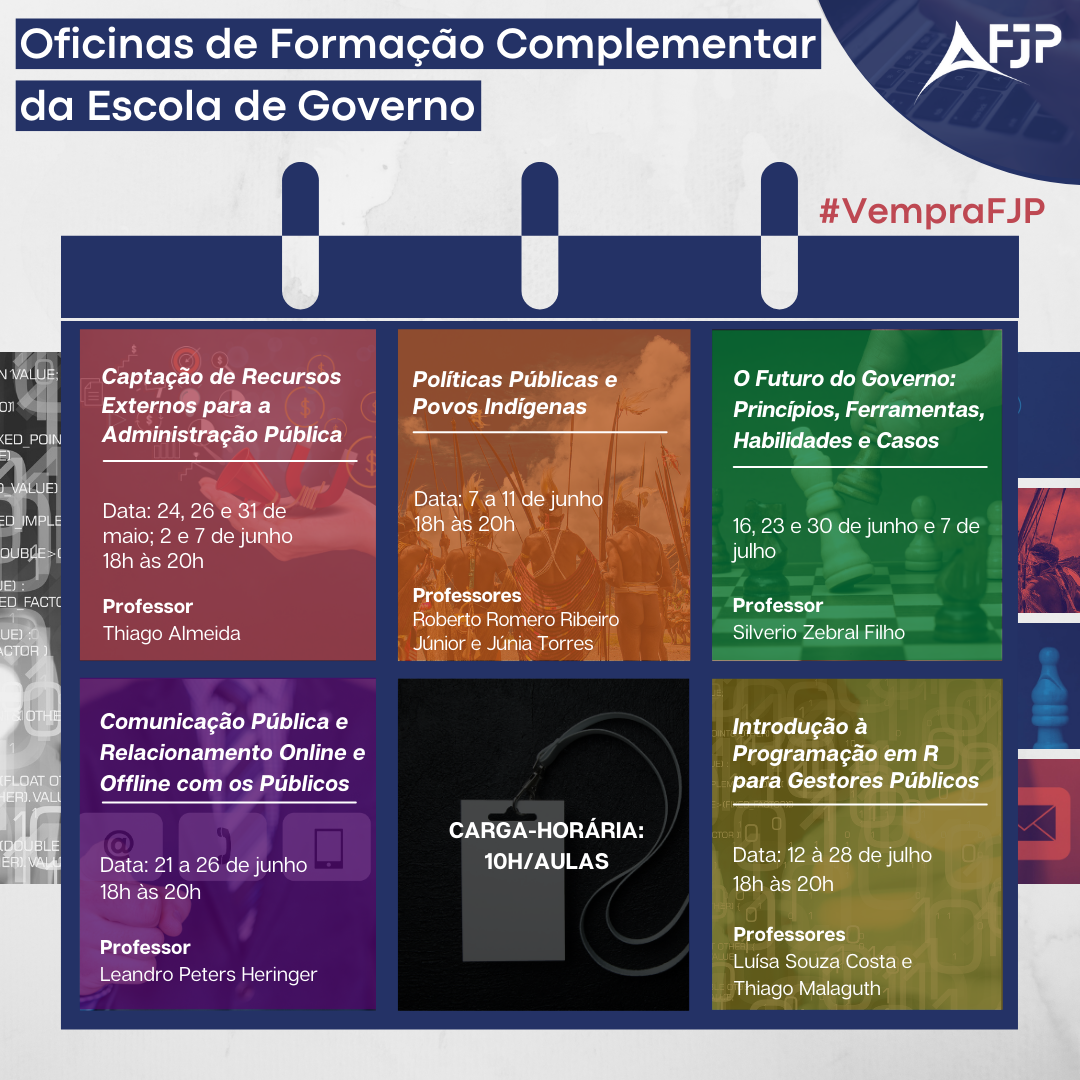 As oficinas de formação complementar da Escola de Governo têm como objetivo o aprofundamento em instrumentos, competências e metodologias relevantes à Administração Pública e sua prática no dia a dia. Para tanto, a metodologia predominante é o emprego de exercícios práticos e métodos de simulação de situações concretas, na busca por aproximação entre teoria e prática e vivência da complexidade e seus desafios, tais como eles ocorrem e demandam a mobilização de capacidades individuais e institucionais. Destinadas a um público variado, as oficinas inovam ao promover o encontro, em um mesmo ambiente de aprendizagem, de pesquisadores, estudantes e praticantes. Finalmente, visando a integração das múltiplas visões sobre o saber e fazer inerente ao Campo de Públicas, a presente iniciativa da Escola de Governo conta com apoio fundamental da Associação Nacional de Ensino e Pesquisa do Campo de Públicas – Anepcp.