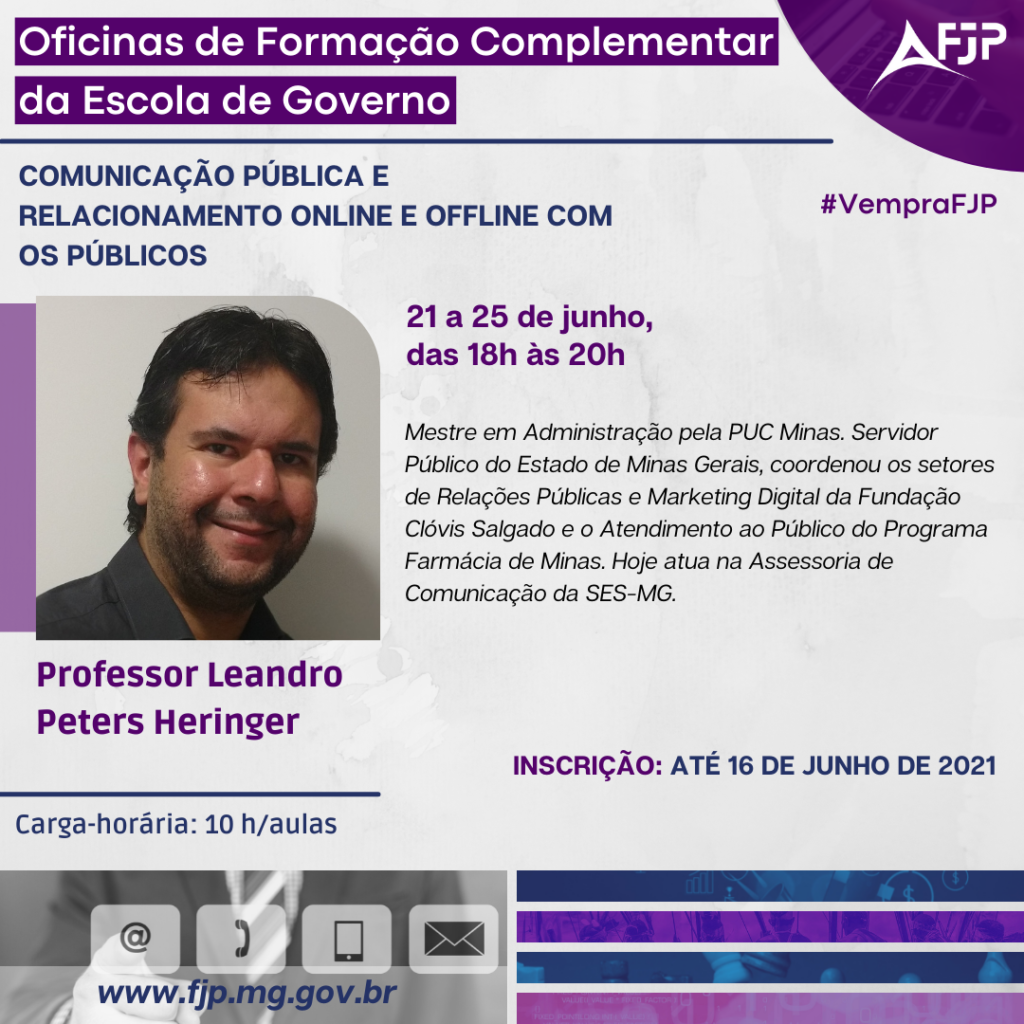 O curso consiste em apresentar os conceitos de comunicação pública, comunicação cidadã, marketing de relacionamento, mídias sociais e gestão de relacionamento, bem como aplicá-los no contexto da Administração Pública. Haverá apresentação de estudos de caso e análise de ambientes virtuais comumente utilizados pelo setor público.