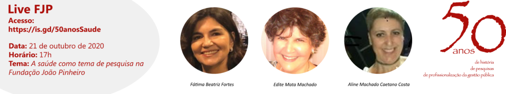 Nesta quarta-feira, 21 de outubro, a Fundação João Pinheiro vai realizar mais uma live comemorativa de seus 50 anos. Desta vez, a pesquisa em saúde nessas cinco décadas será abordada pelas pesquisadoras aposentadas da instituição Fátima Beatriz Fortes e Edite Mata Machado, e pela convidada Aline Machado Caetano Costa, diretora de Informações Epidemiológicas da Secretaria de Estado de Saúde. O acesso é pela plataforma Zoom a partir das 17h: https://is.gd/50anosSaude
